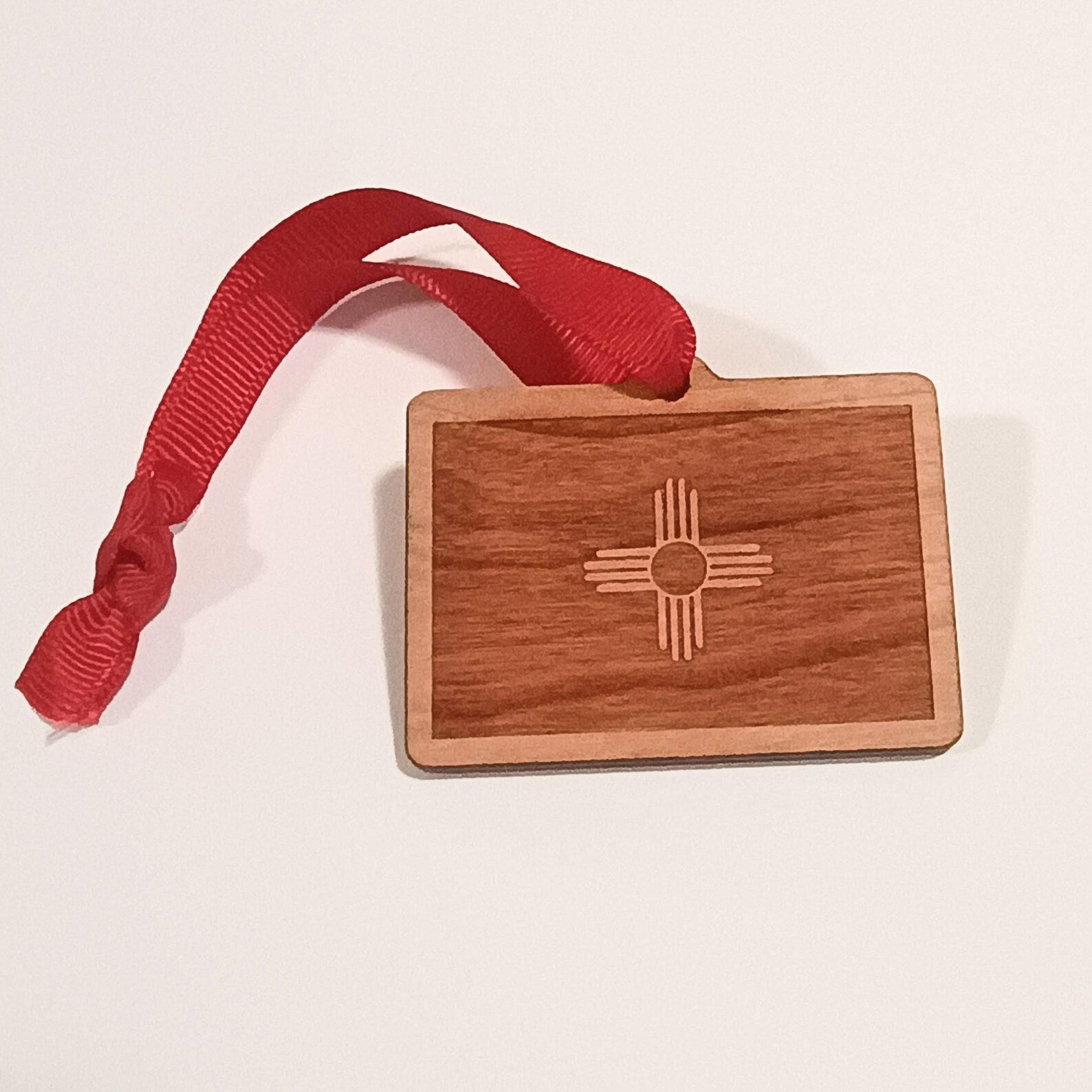 A New Mexico state flag ornament created out of cherry wood. The ornament measures approximately 2 1/4" x 1 3/4" (5.7 x 4.7 cm) and is 1/8" (3mm) in width. The ornament is made out of a solid piece of cherry wood that is brown with rich red hues.
